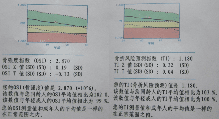 骨密度儀會(huì)根據(jù)受檢者資料自動(dòng)算出T值和Z值數(shù)據(jù)。T值是將檢查所得到骨密度(BMD)與正常年輕人群(30-35歲)的BMD相比,以得出高出(+)或低于(-)年輕人的標(biāo)準(zhǔn)差(SD)數(shù),是診①斷骨質(zhì)疏松癥最有意義的數(shù)值。Z值是將檢查所測(cè)得的BMD與正常同齡人群的BMD比較而得出的值。雖然Z值對(duì)檢查骨質(zhì)疏松癥的意義不大,但是可以反映骨質(zhì)疏松的嚴(yán)重程度。