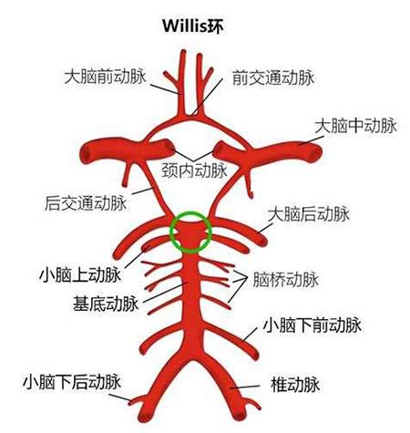 前交通動(dòng)脈把兩側(cè)的大腦前動(dòng)脈鏈接起來,后交通動(dòng)脈把頸內(nèi)動(dòng)脈系統(tǒng)和椎基底動(dòng)脈系統(tǒng)鏈接起來,在腦底腳間池、視交叉周圍形成不規(guī)則的七邊形環(huán)狀結(jié)構(gòu)。動(dòng)脈環(huán)發(fā)出很多分支,給三腦室、背側(cè)丘腦、下丘腦和中腦等重要結(jié)構(gòu)供血。